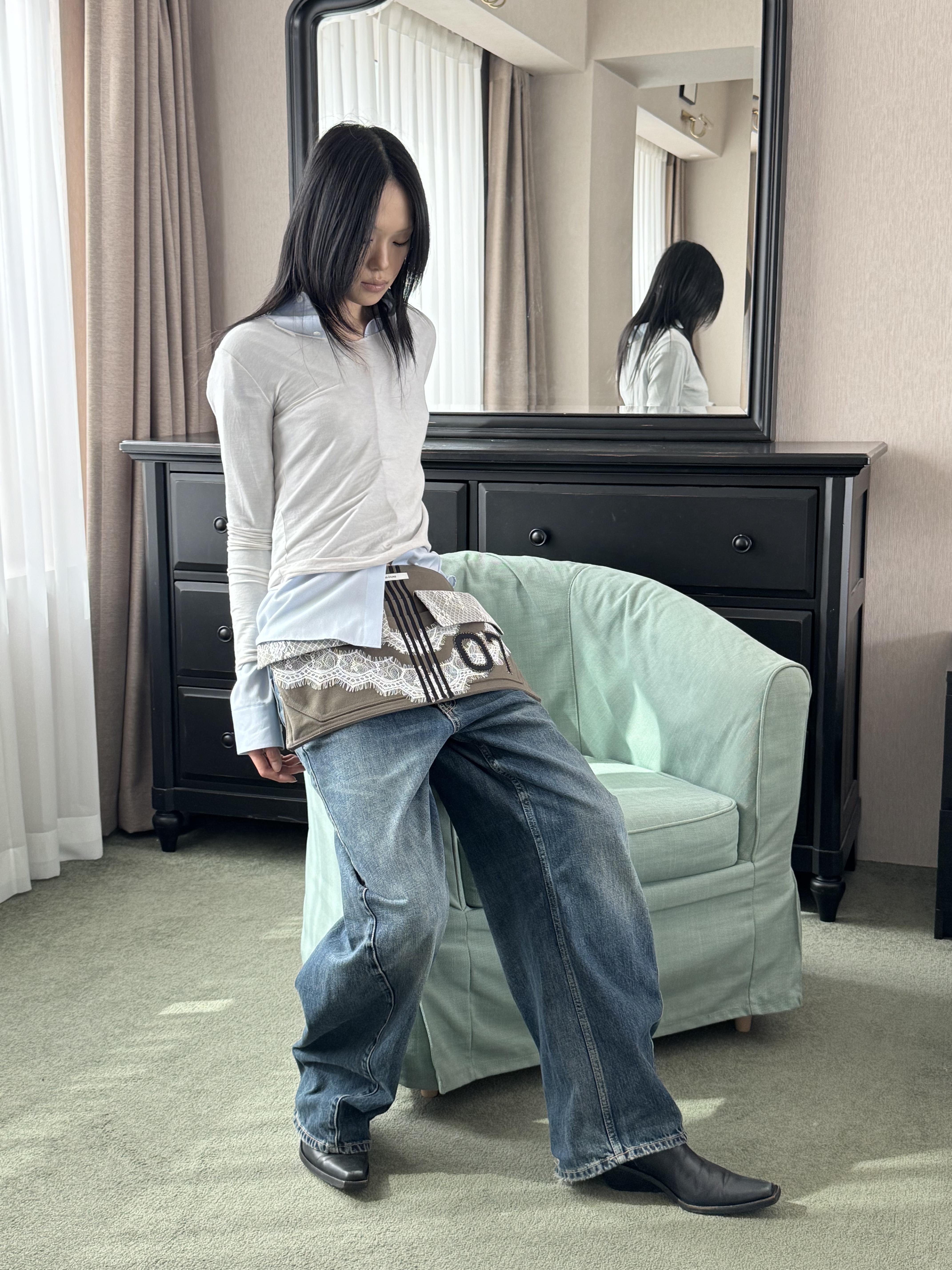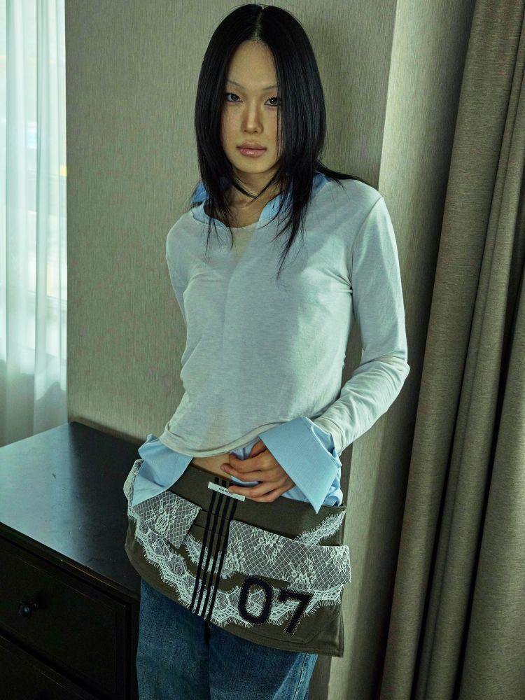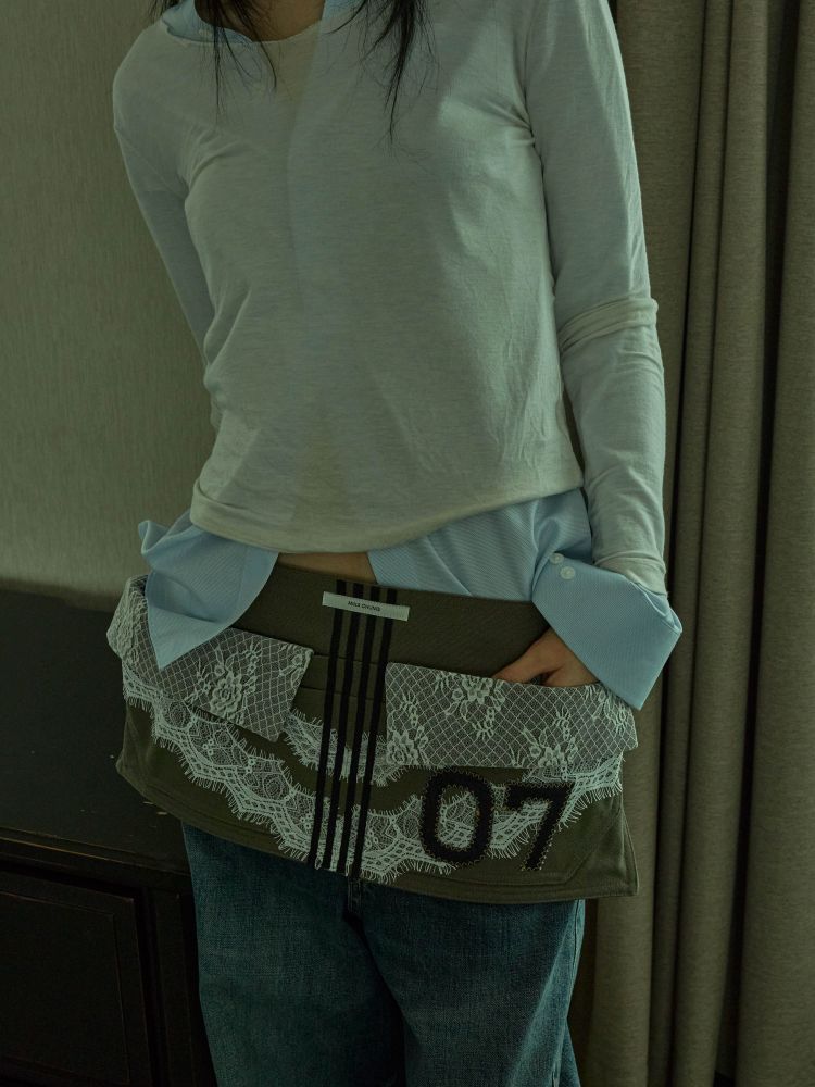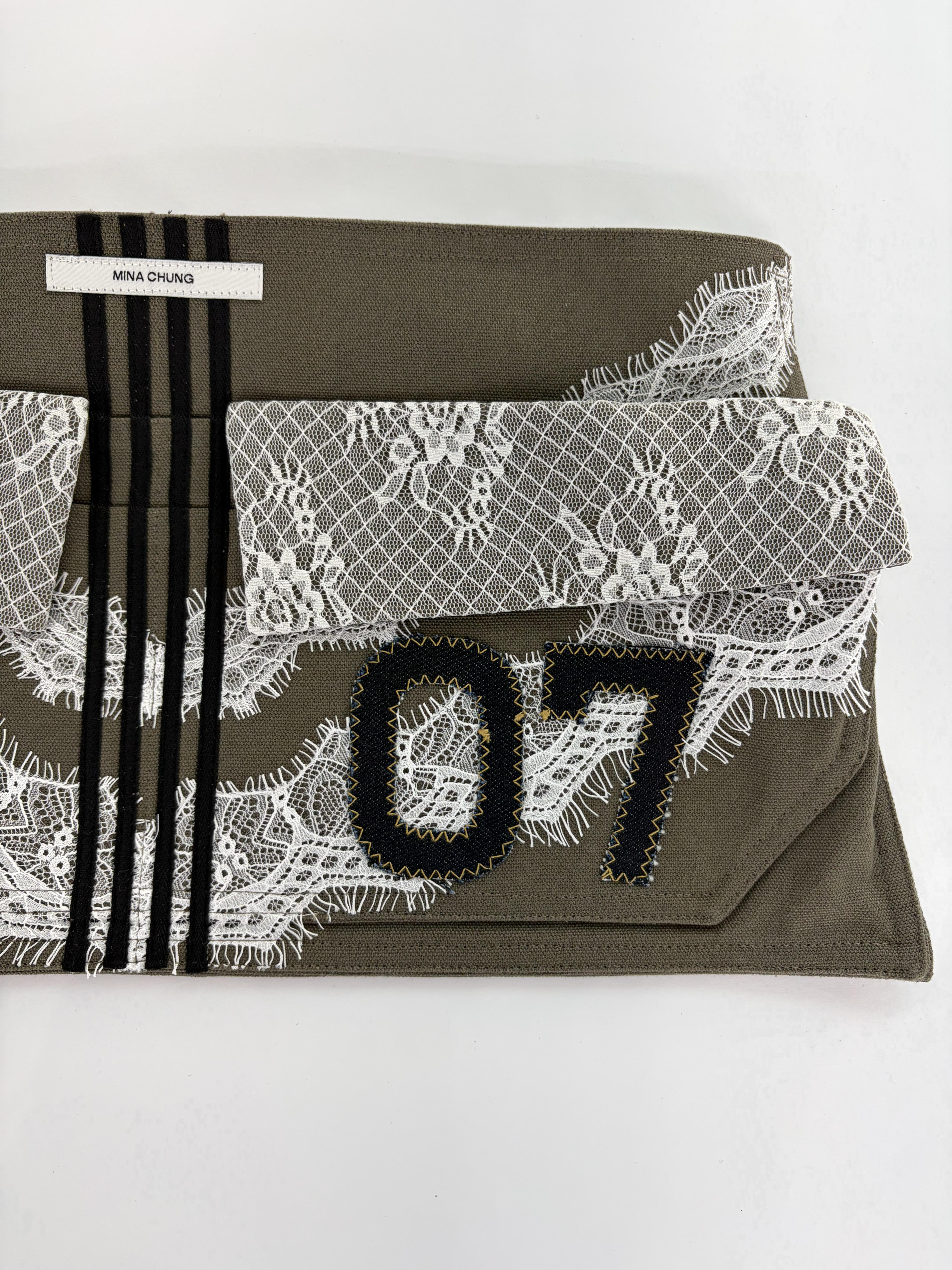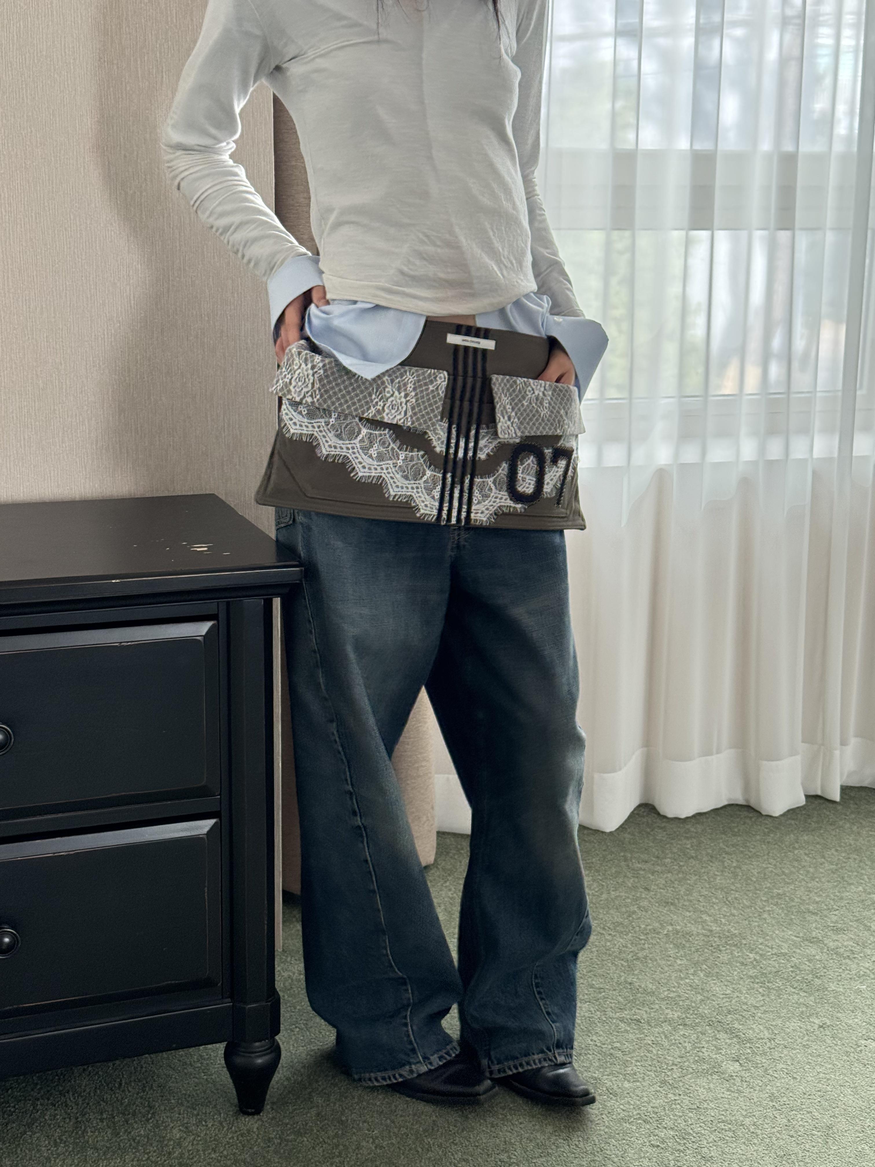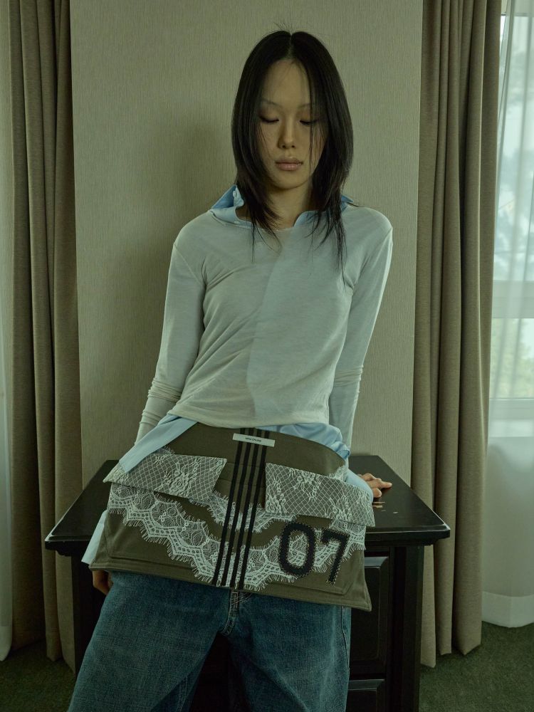 워크웨어가 연상되는 카키 캔버스에 레이스 디테일을 더하여, 유틸리티 로맨틱 무드를 의도했습니다.