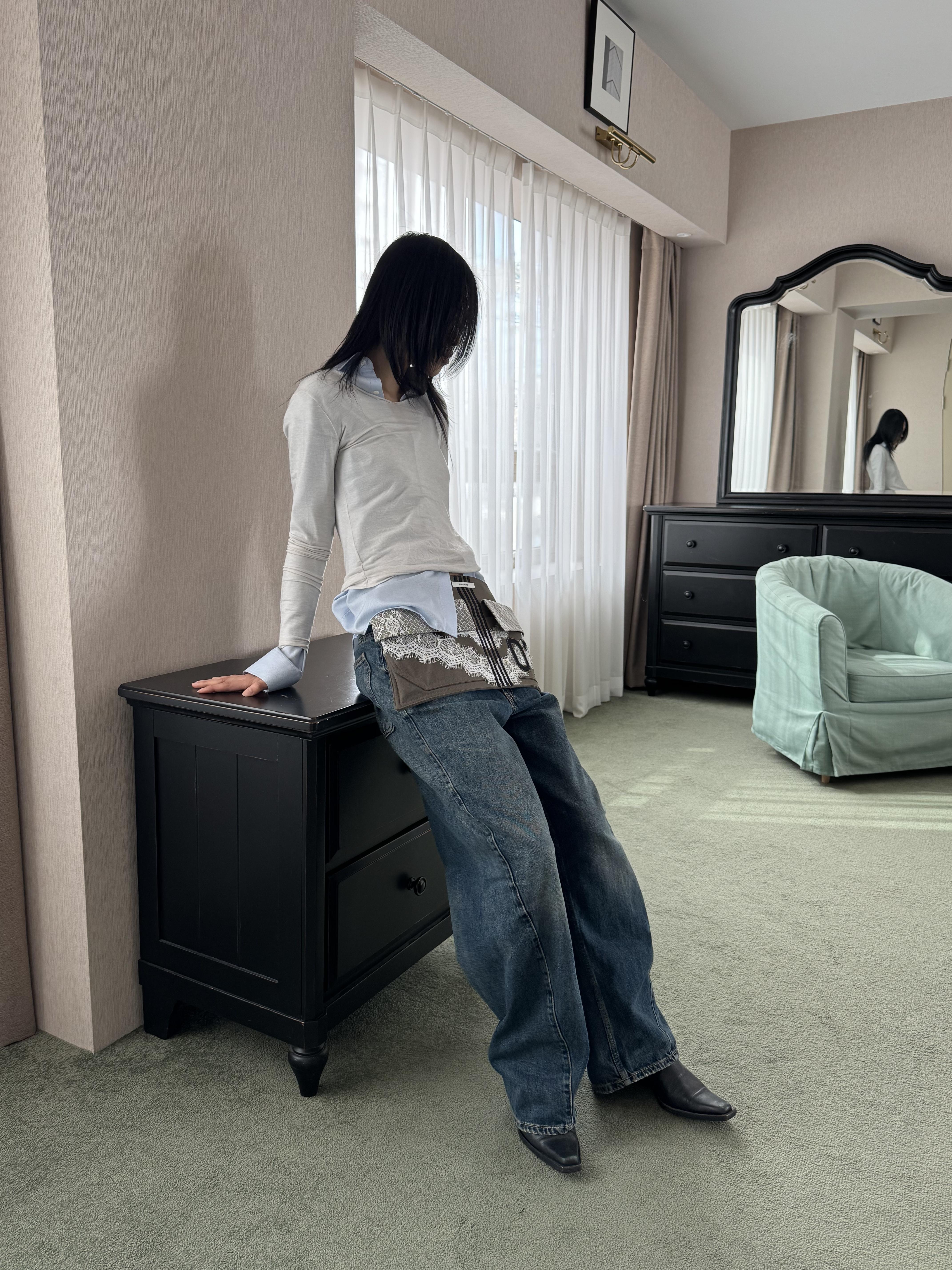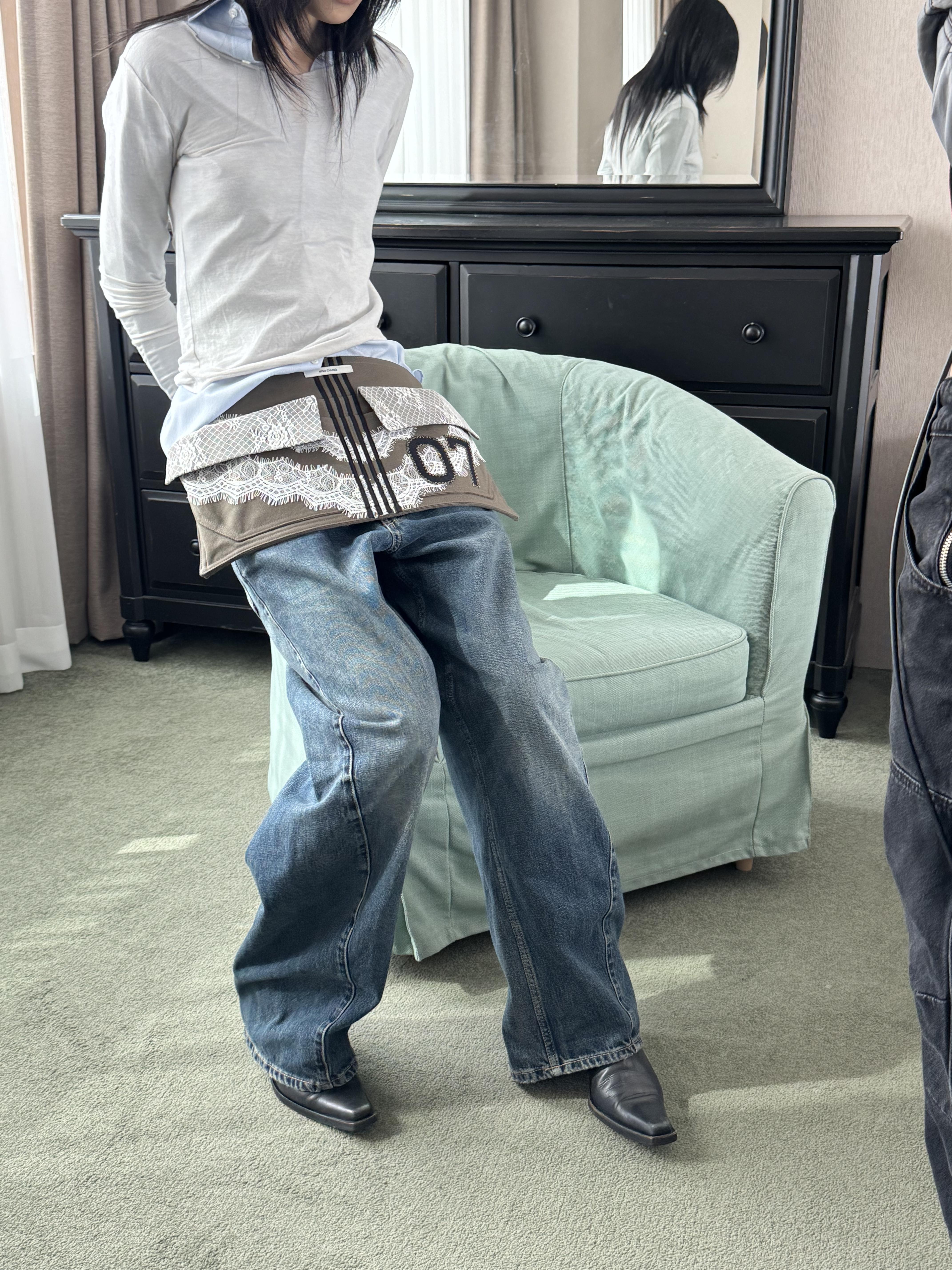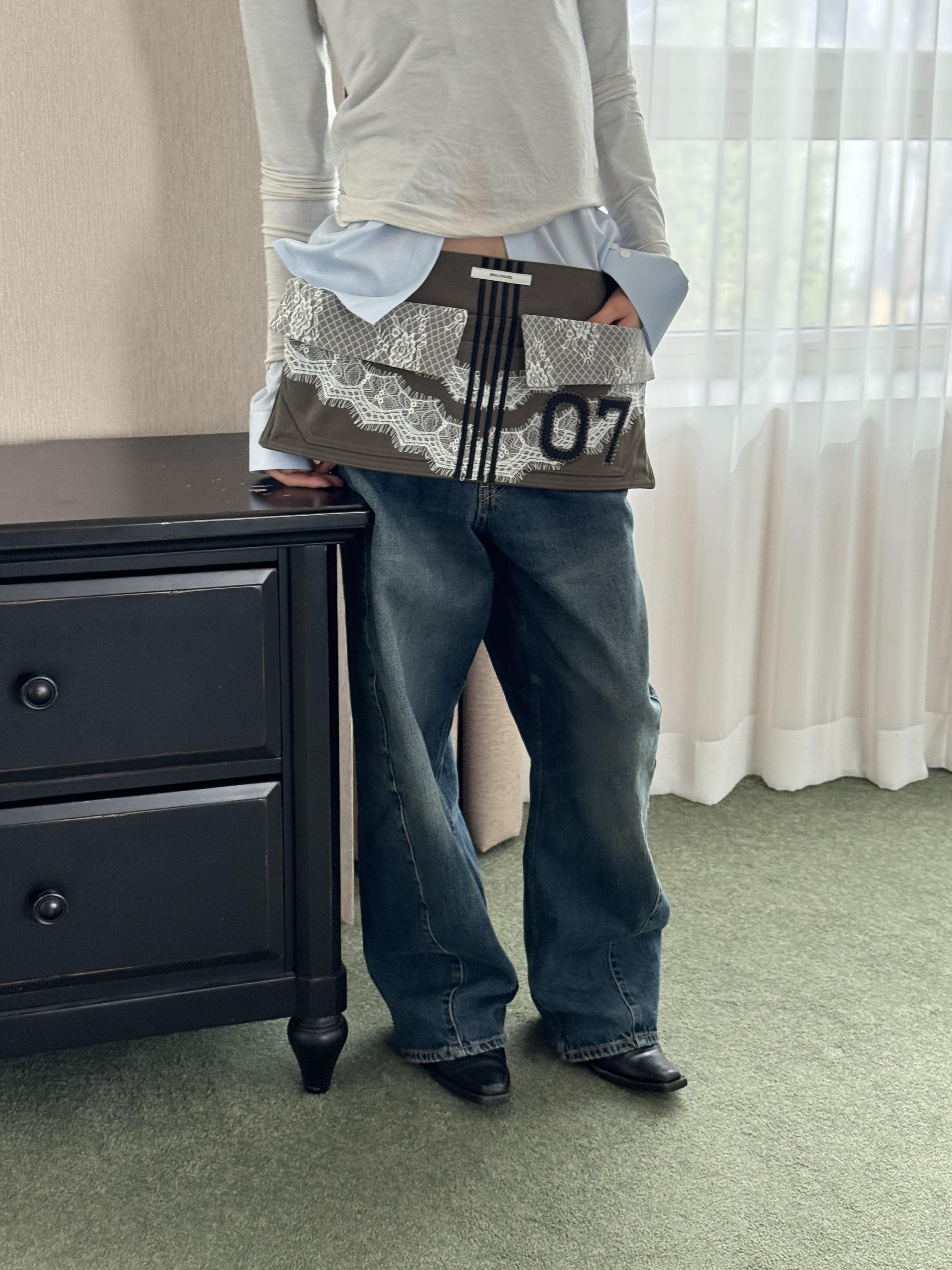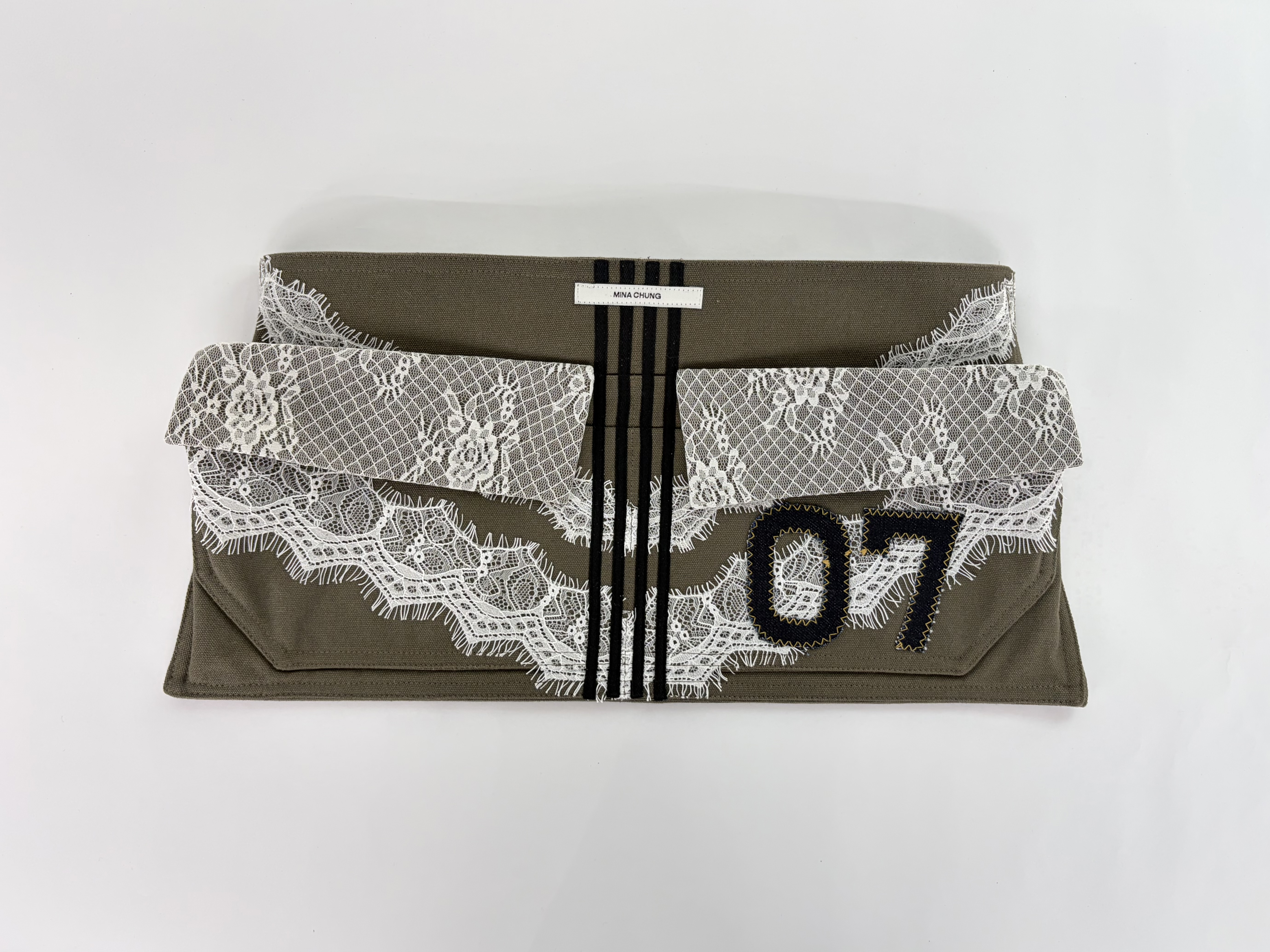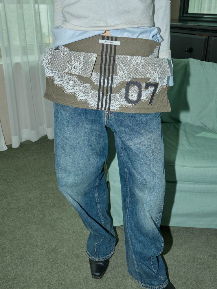 워크웨어가 연상되는 카키 캔버스에 레이스 디테일을 더하여, 유틸리티 로맨틱 무드를 의도했습니다.