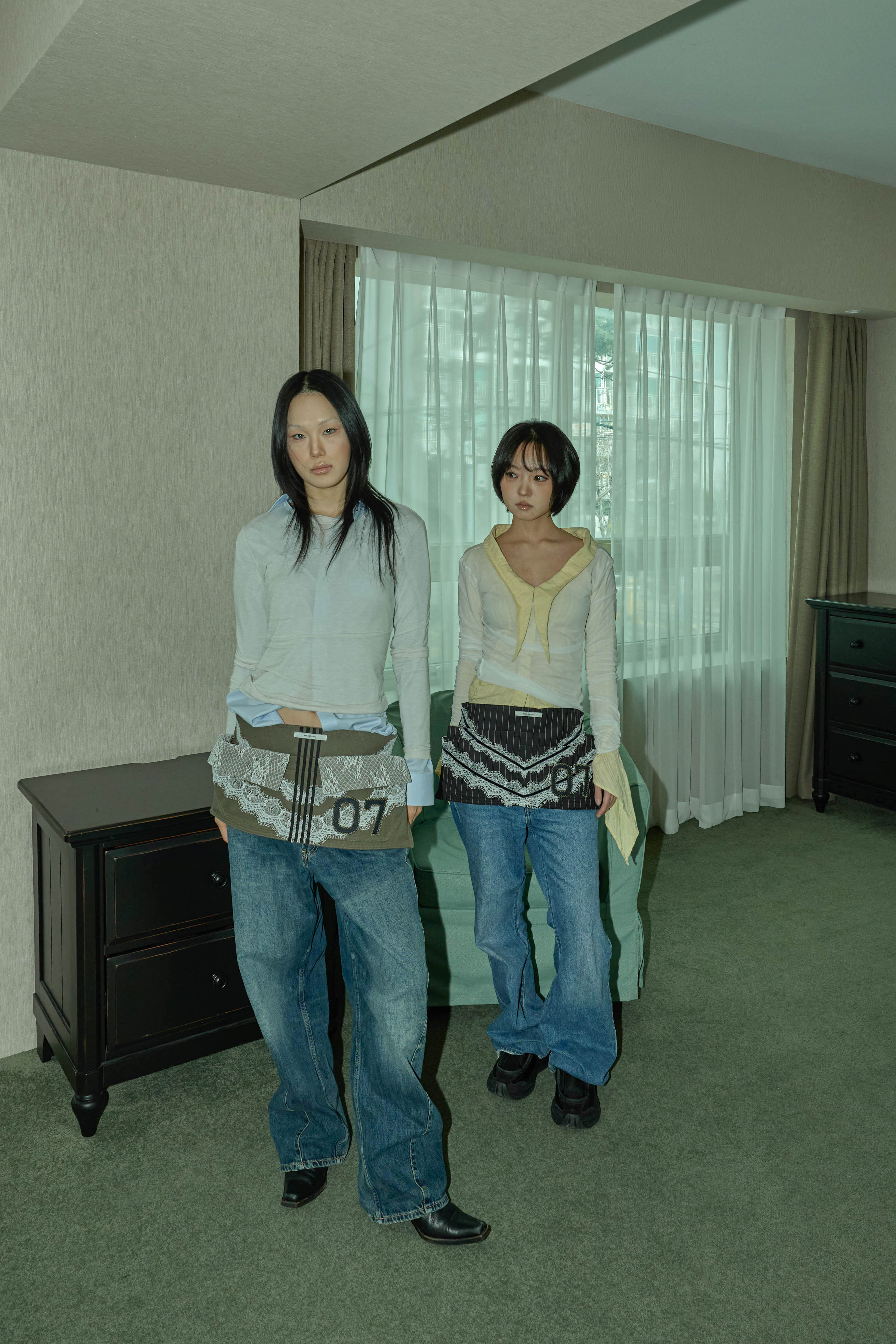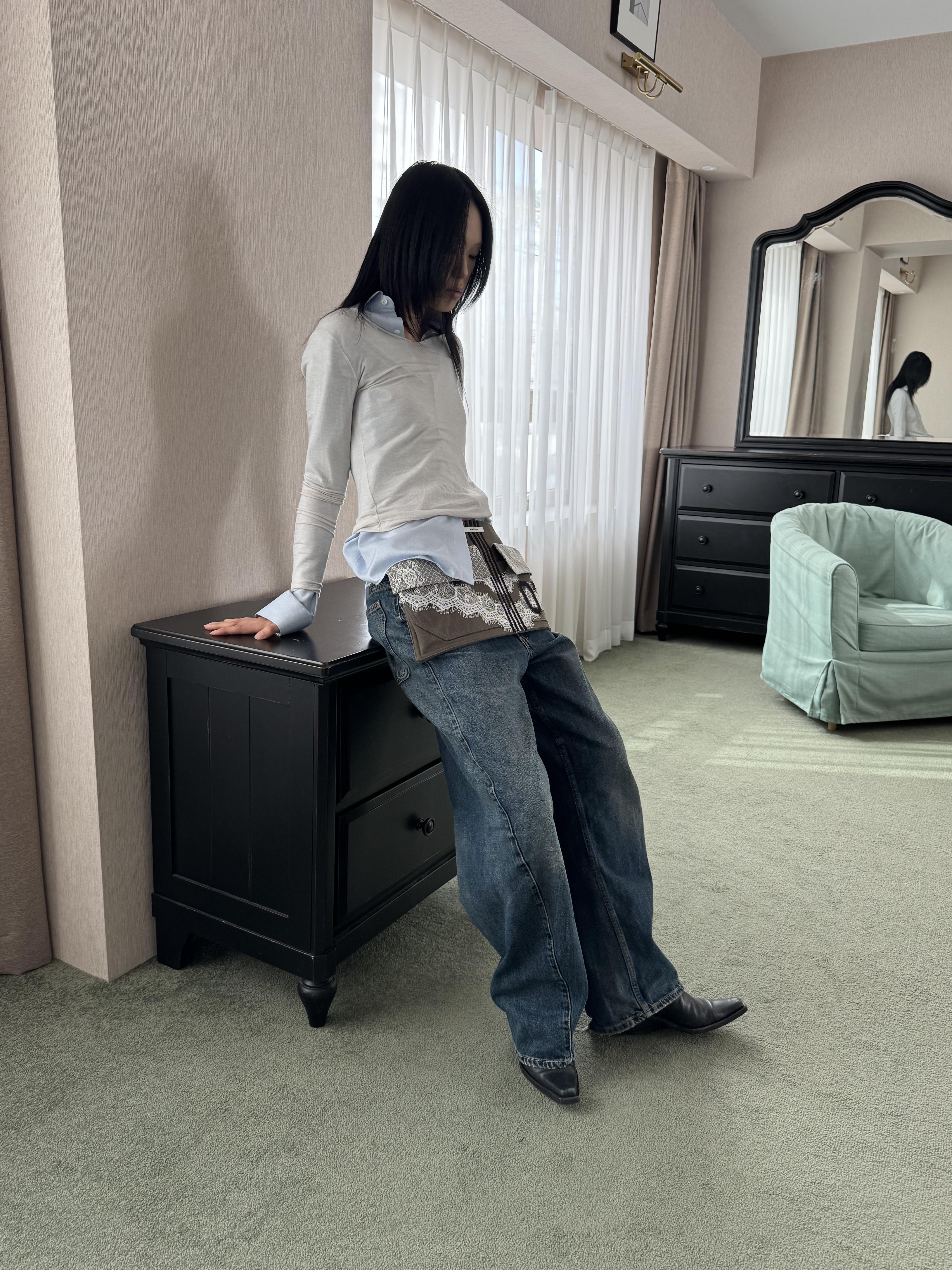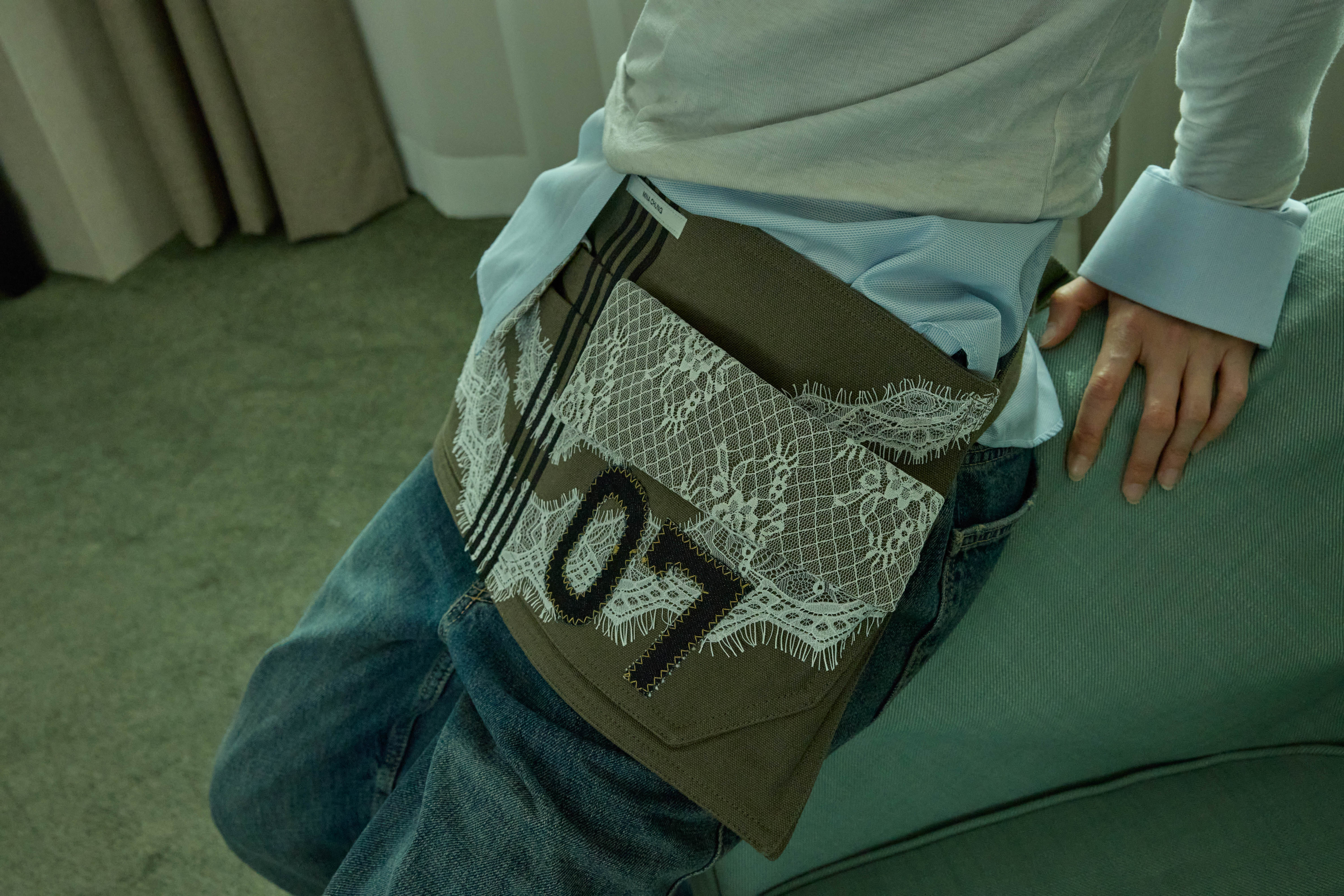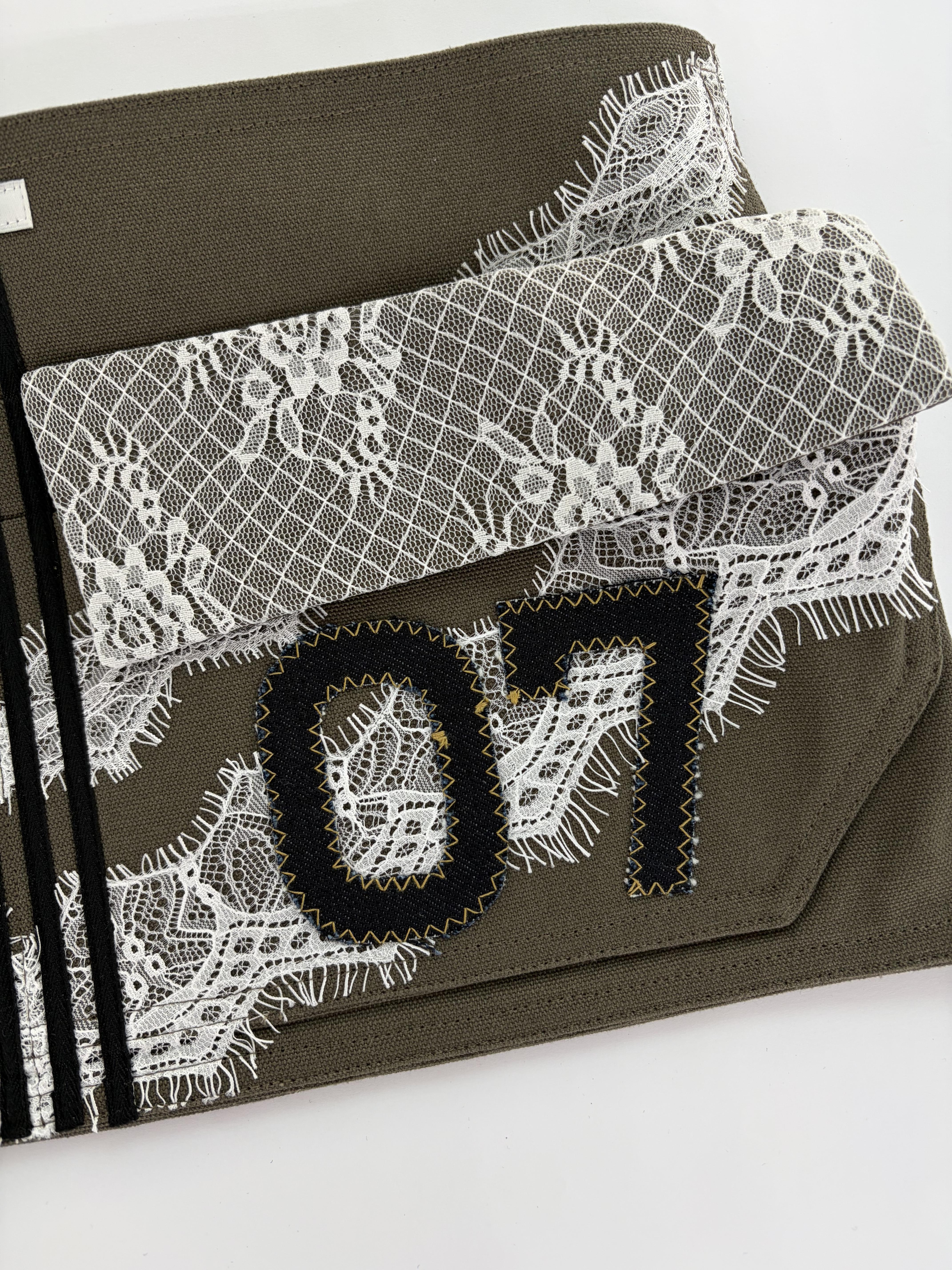 워크웨어가 연상되는 카키 캔버스에 레이스 디테일을 더하여, 유틸리티 로맨틱 무드를 의도했습니다.