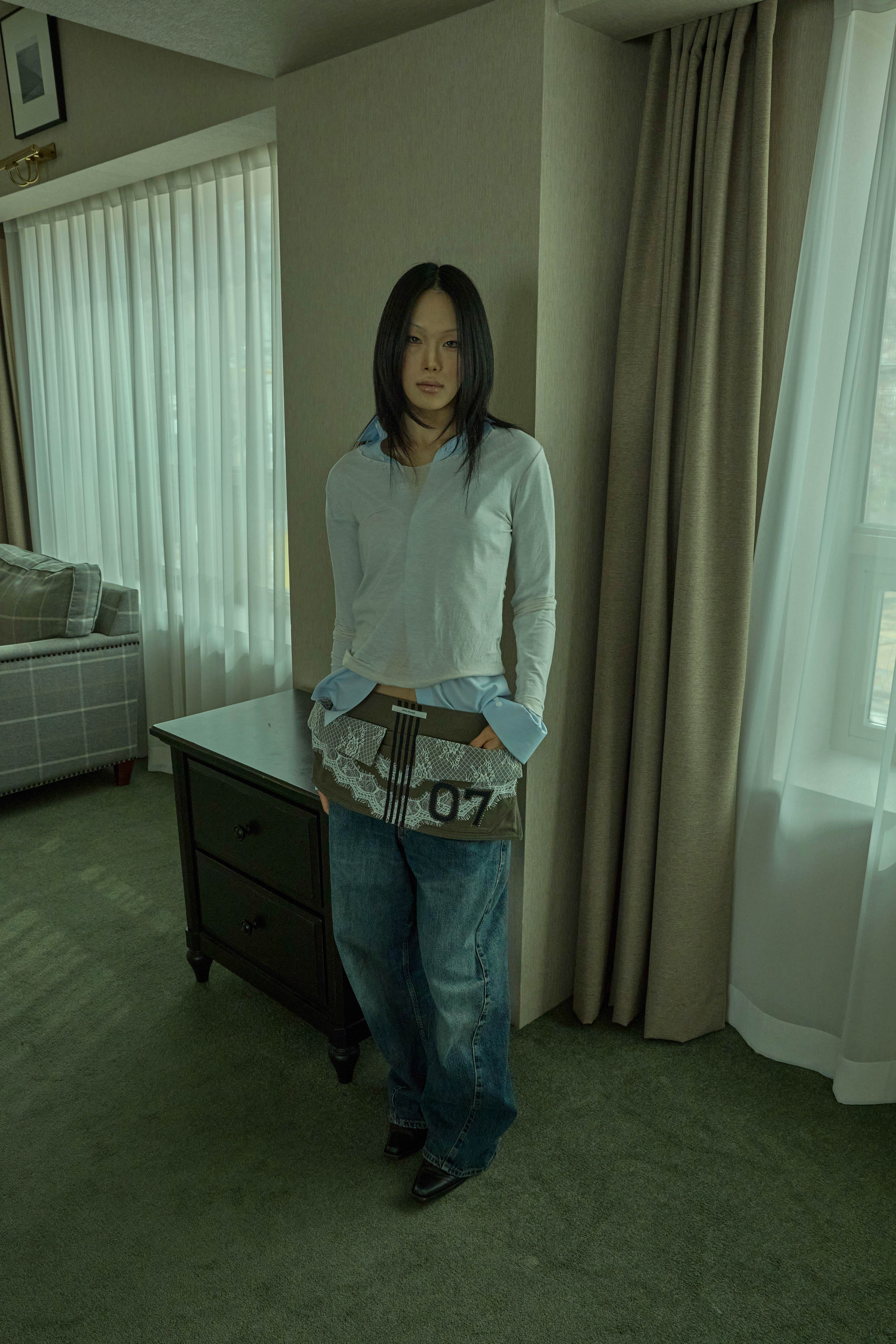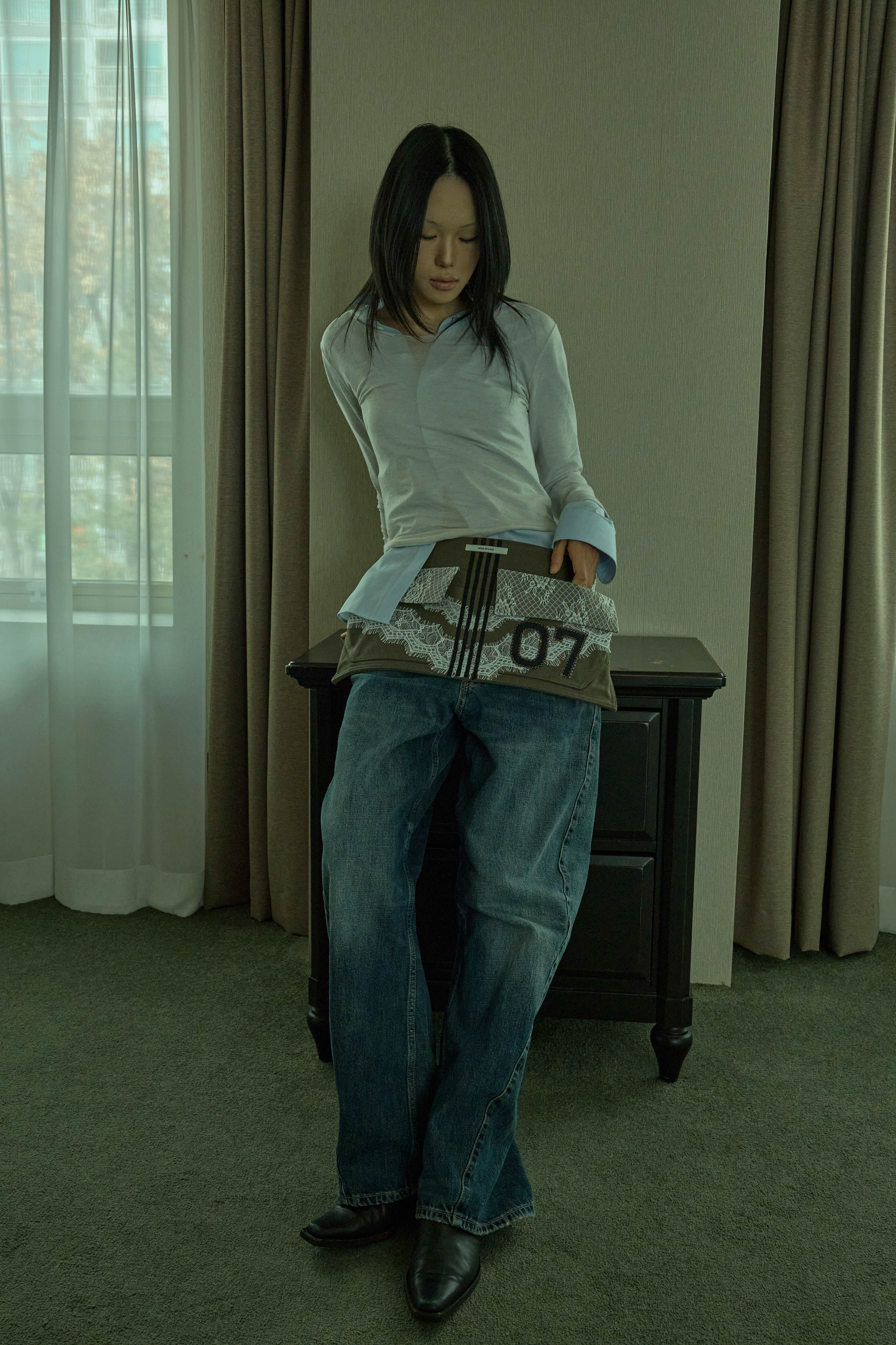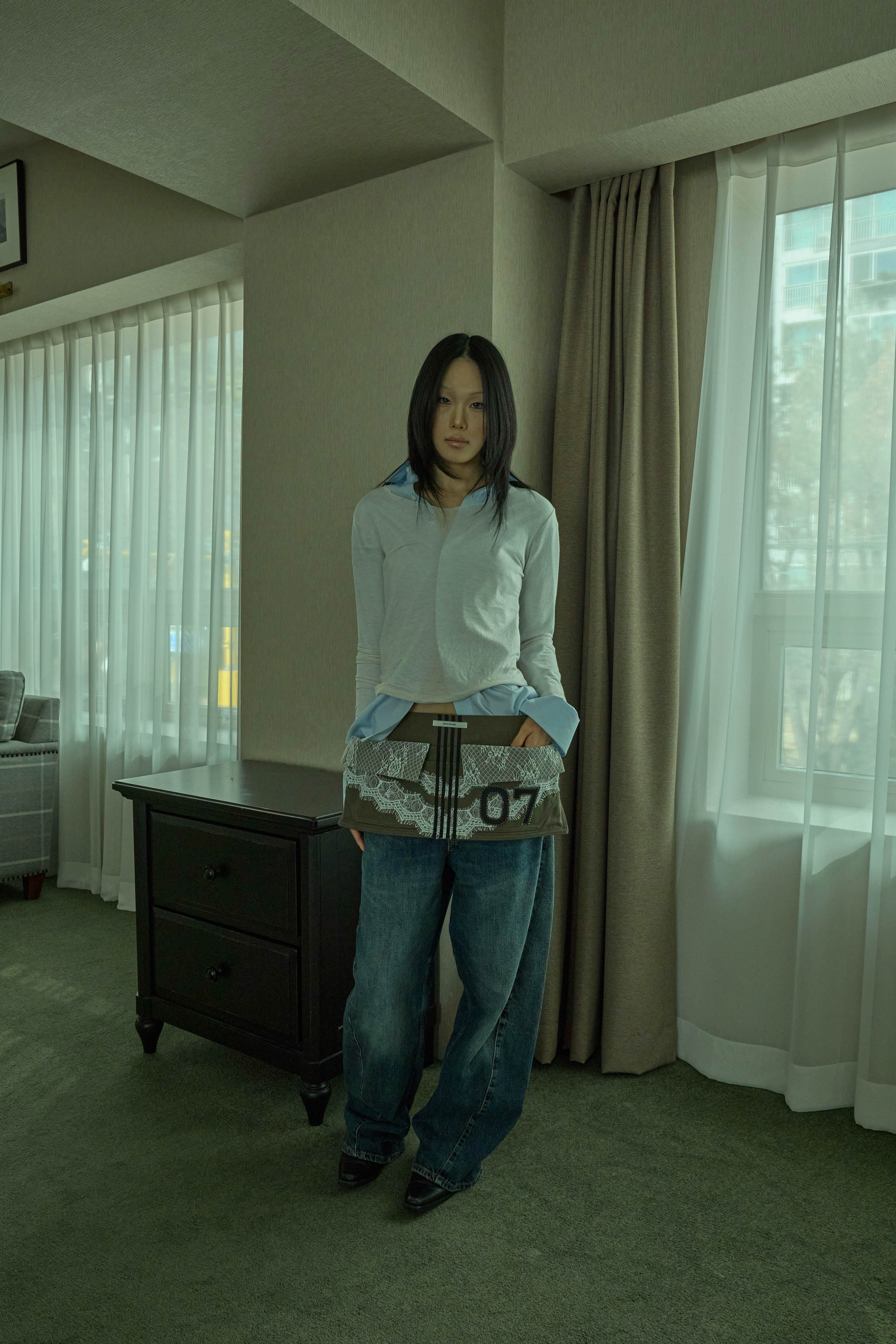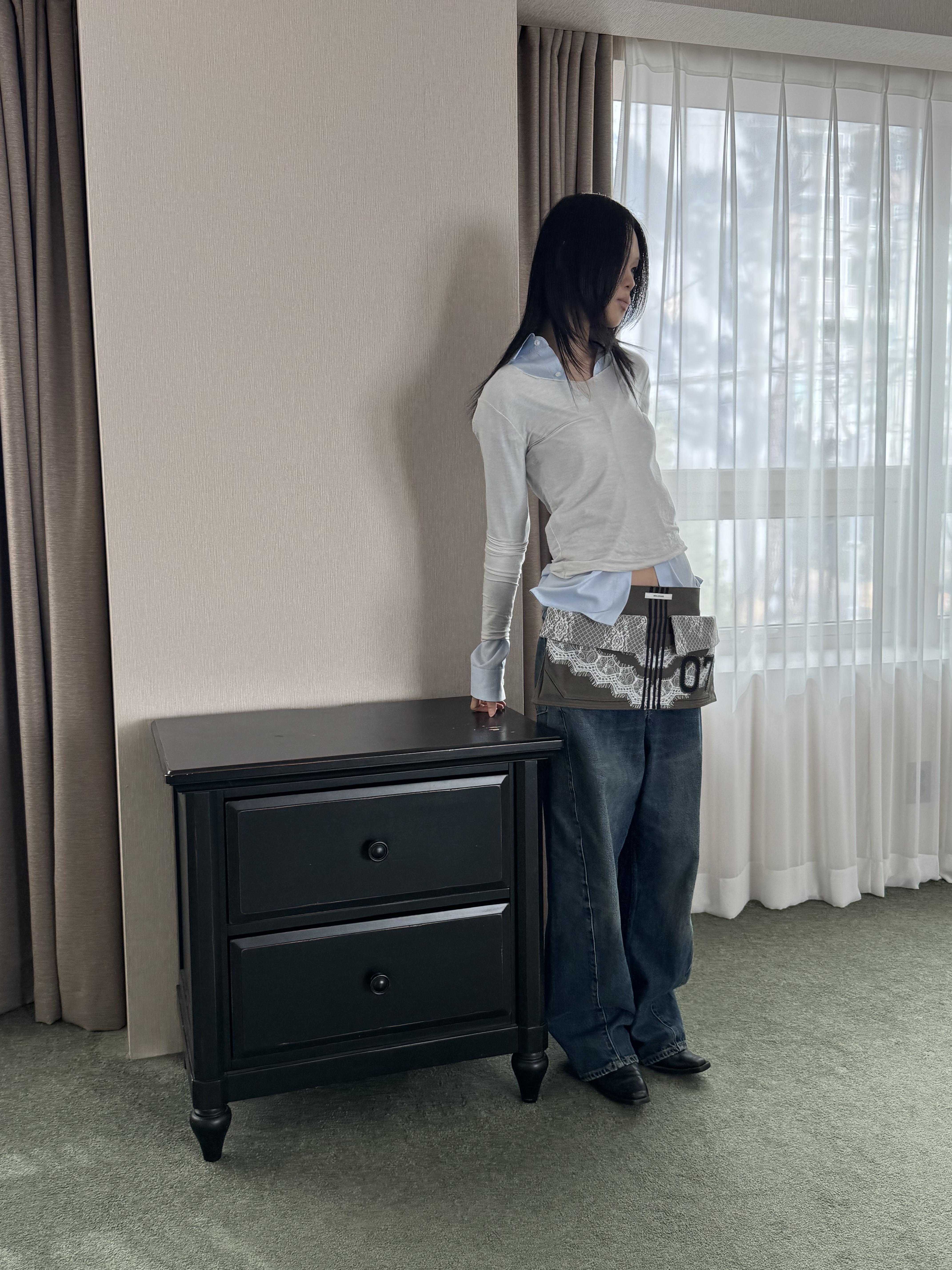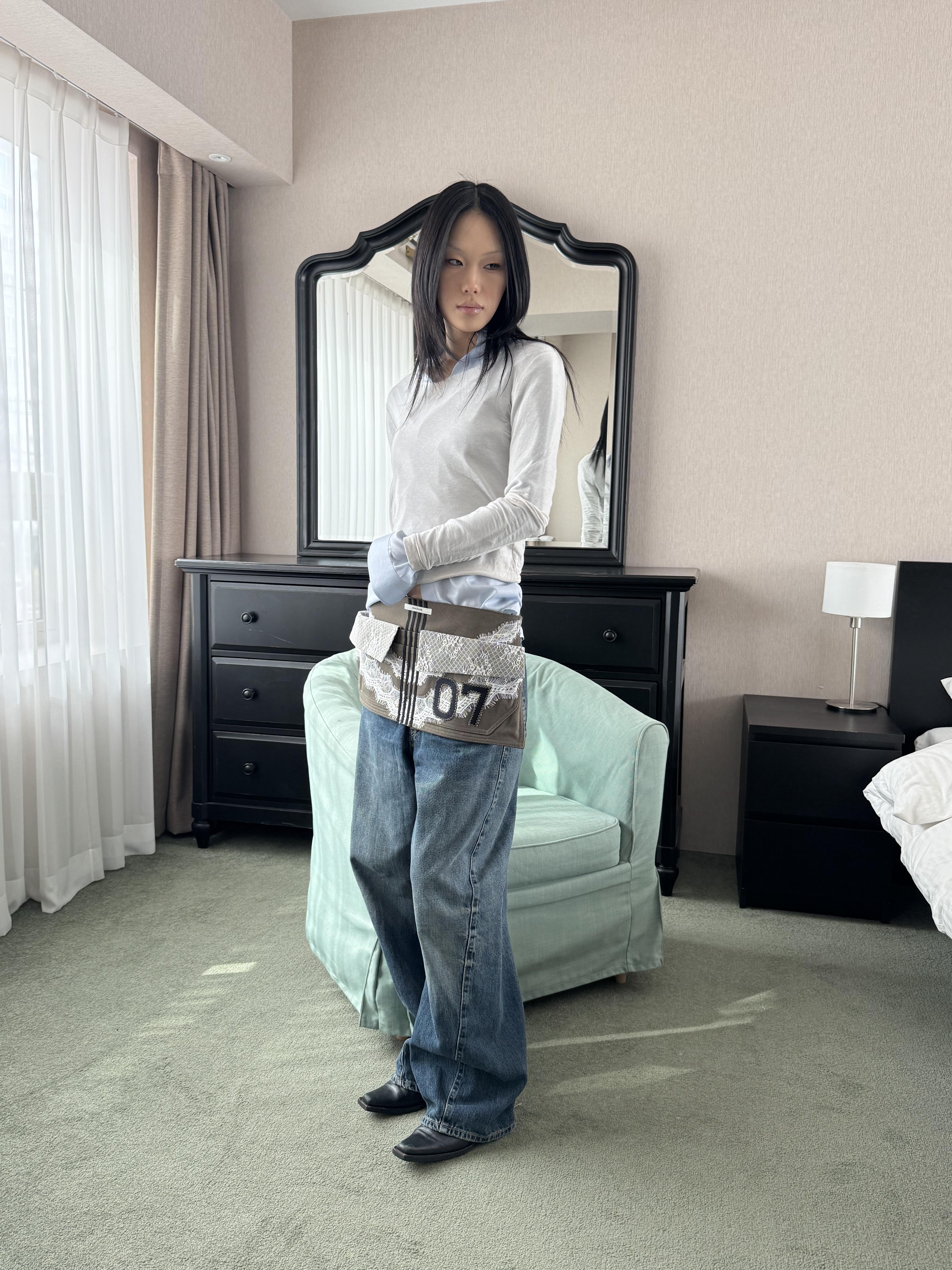 워크웨어가 연상되는 카키 캔버스에 레이스 디테일을 더하여, 유틸리티 로맨틱 무드를 의도했습니다.